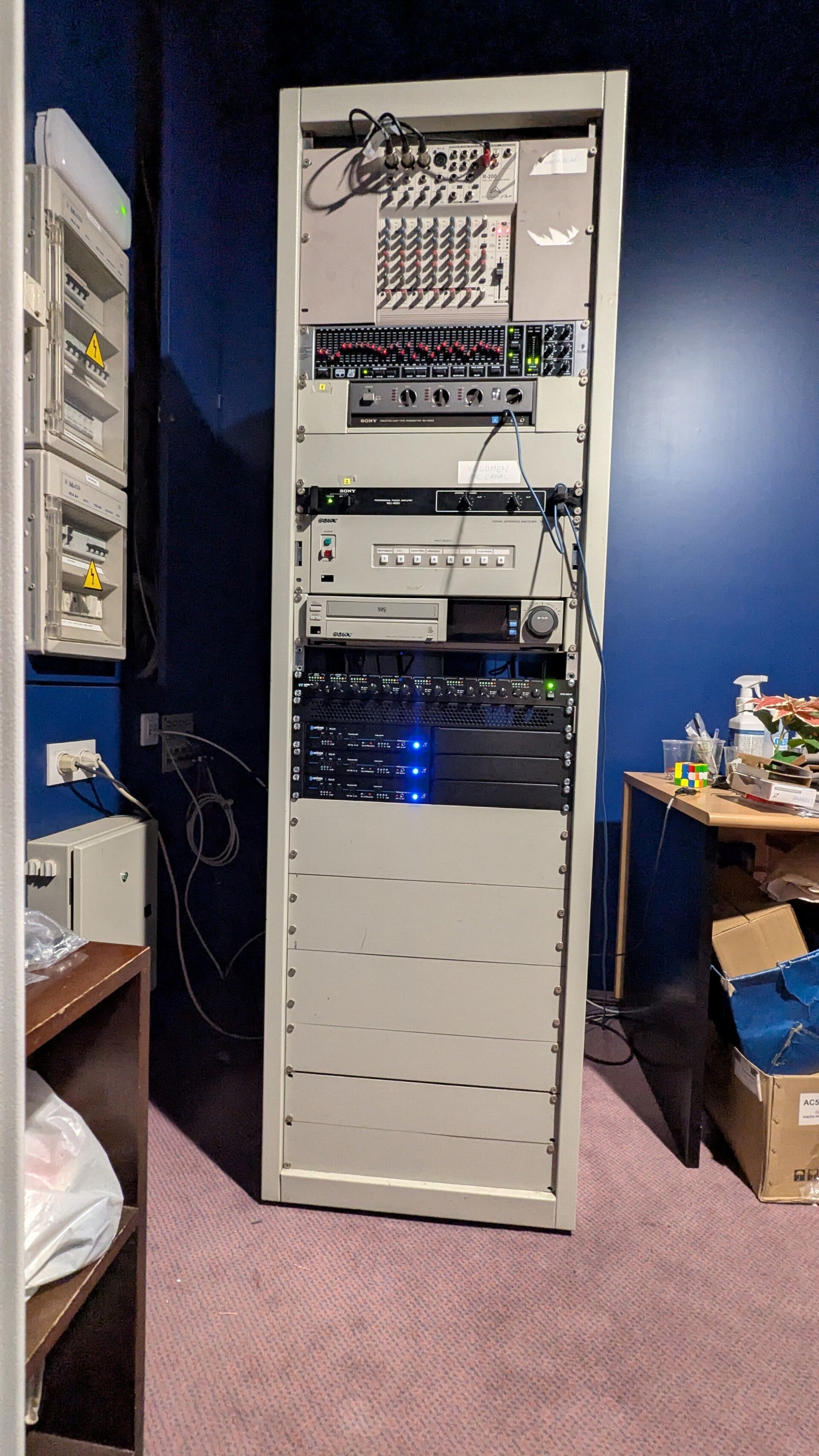 Foto 2. Frente del rack de control, donde se observan los amplificadores y el mezclador/splitter instalado.